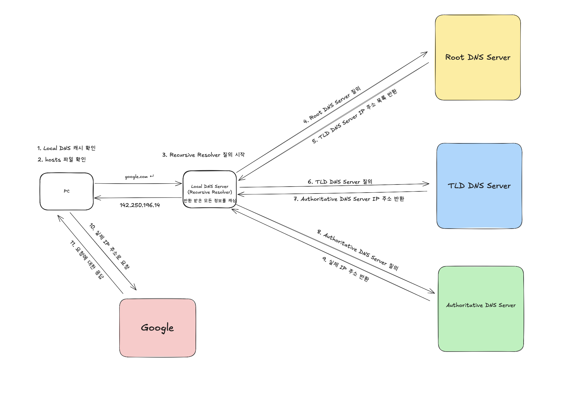 - 브라우저/애플리케이션 → OS 캐시 → hosts 파일 → DNS 리졸버 → 로컬 DNS 서버